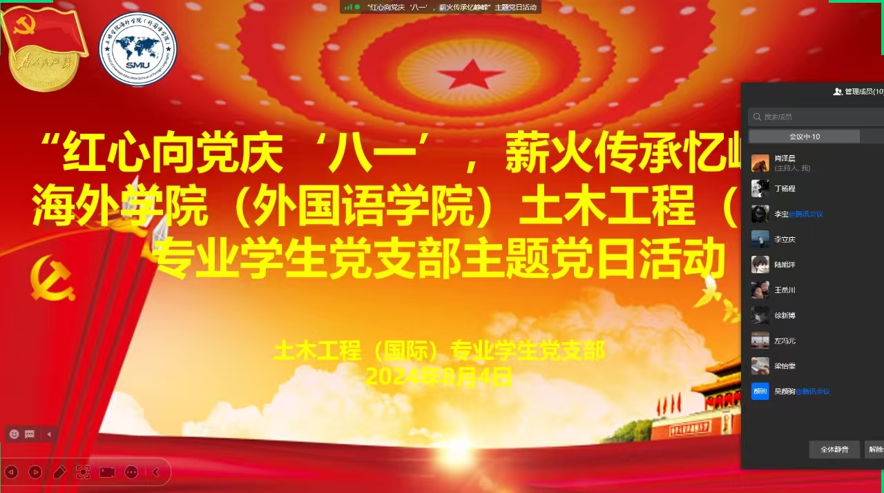 “人民军队的历史辉煌,是鲜血生命铸就的,永远值得我们铭记。人民军队的历史经验,是艰辛探索得来的,永远需要我们弘扬。人民军队的历史发展,是忠诚担当推动的,永远激励我们向前。”为庆祝中国人民解放军建军97周年,重温习近平总书记关于国防和军队建设的重要论述和指示批示精神,深入贯彻习近平强军思想,回顾先烈抛头颅、洒热血的峥嵘岁月,8月4日晚,土木工程(国际)专业学生党支部以线上会议的形式开展了红心向党庆“八一”,薪火传承忆峥嵘主题活动,会议开始支部书记李宝带领全体与会党员学习习近平总书记在庆祝中国人民解放军建军90周年大会上的讲话原文,并观看国防教育影片《建军大业》。