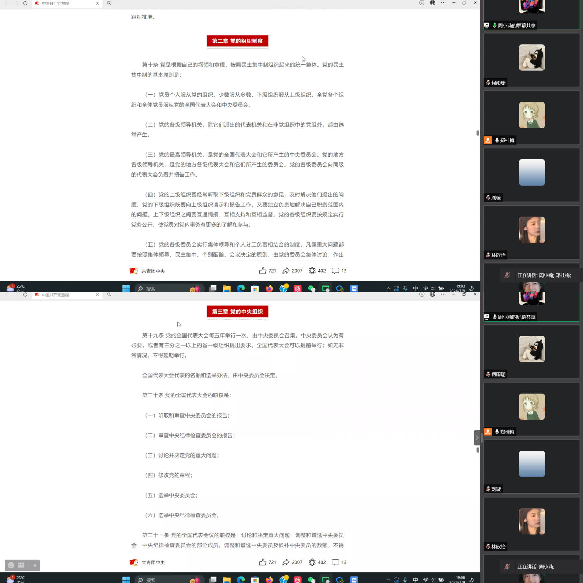 会上,围绕第一议题“习近平:发展新质生产力是推动高质量发展的内在要求和重要着力点”进行了学习。支部廖靖凡同志和林欣怡同志结合学习和工作实际畅谈感悟感想。随后,蒋小兰同志带领支部全体党员学习了《中国共产党章程》第二章《党的组织制度》和第三章《党的中央组织》。支部党员纷纷表示收获良多。郑桂梅同志说道:“通过再次重温党章,我认识到作为一名党员要不断坚定理想信念,提高思想政治素养,同时要不断夯实专业素养,发挥先锋模范作用。”张琳琼同志则对“全心全意为人民服务”这一点感触颇深,她表示作为一名学生党员干部,要吃苦耐劳、迎难而上,为服务师生奉献一份力量。