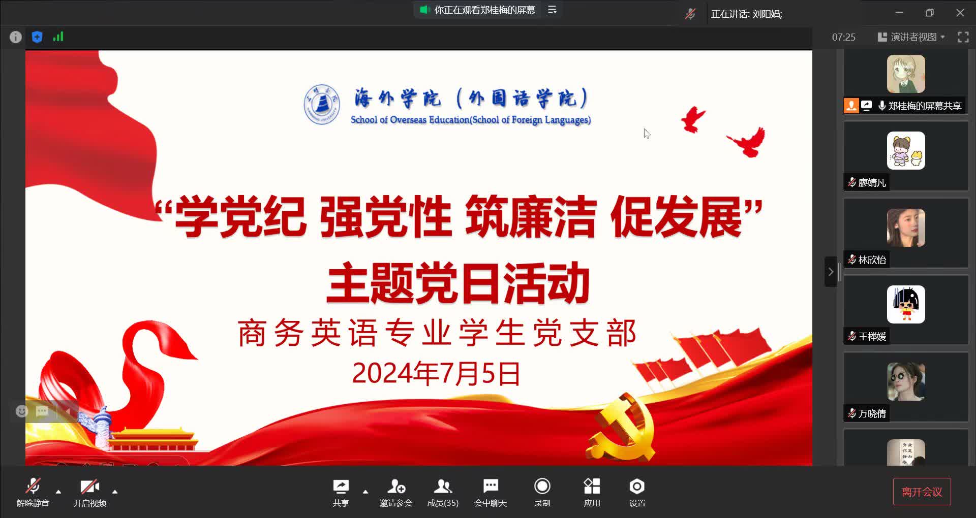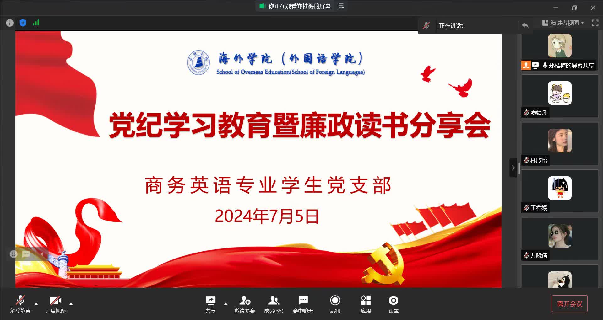 为引导党员学纪、知纪、明纪、守纪,践行初心使命、担当作为、奋勇争先,商务英语专业学生党支部于7月5日开展了“学党纪 强党性 筑廉洁促发展”主题党日活动,支部全体党员参加。