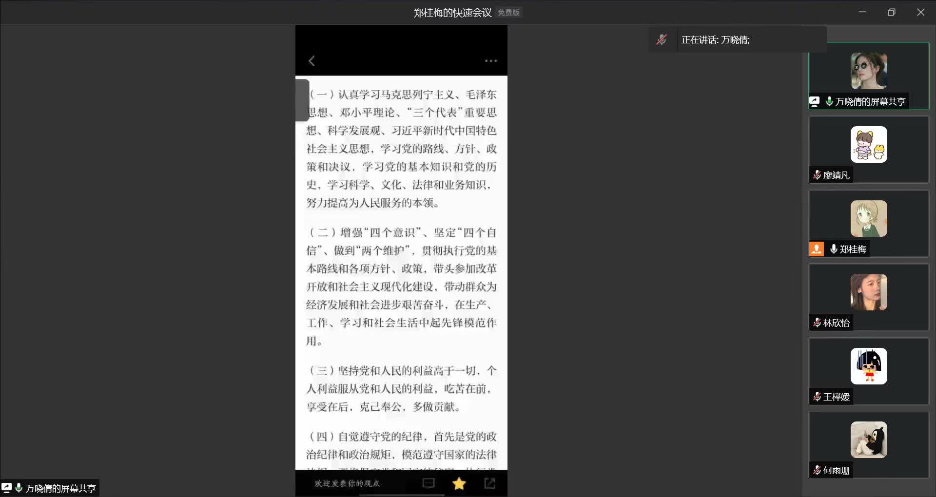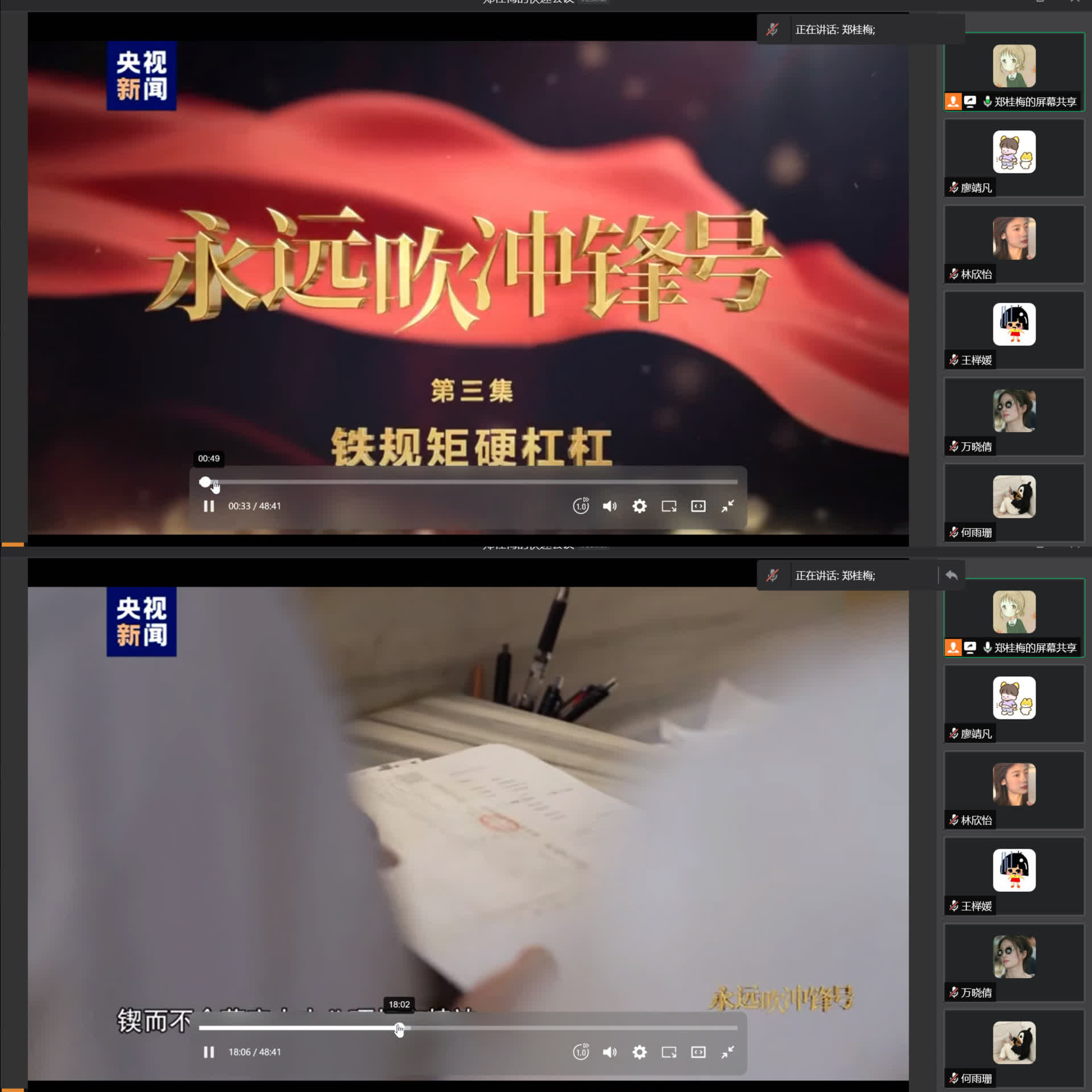最后,全体党员通过线上屏幕共享的形式集中观看电视专题片《永远吹冲锋号》第三集《铁规矩硬杠杠》。支部书记刘阳娟表示“‘党的纪律是最重要、最根本的纪律,如同带电的高压线,任何一个党员都不能触碰。’在日常学习和工作生活中,要时刻紧绷纪律之弦,严守党的纪律,做风清气正的廉洁党员。”她指出,要牢记党员身份,明确意识纪律的严肃性和不可逾越性,做到心中有戒、行有所止,不断筑牢知敬畏、存戒惧、守底线的思想防线和讲忠诚、促廉洁的廉政根基。