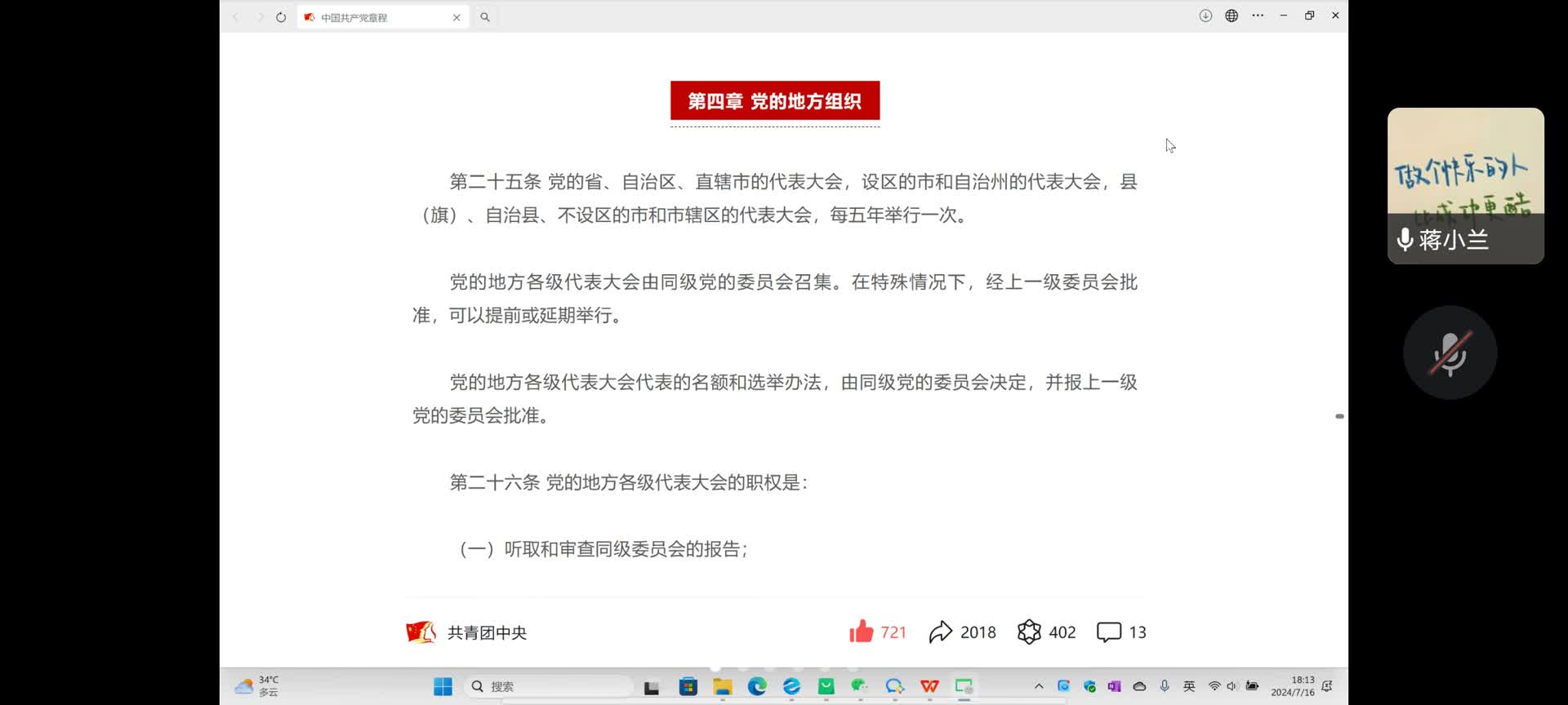 会上,支部开展了重温党章、廉政读书分享等活动。首先,蒋小兰同志领学《中国共产党章程》的第四章《党的地方组织》、第五章《党的基层组织》和第六章 《党的干部》,全体党员再次重温党章内容,汲取奋进力量。随后,陈芊芊同志分享《红色家规》(王纪一)一书中的文章,她号召要学习朱德元帅的高尚品质和崇高精神;林欣怡同志分享《追问》一书中的文章,她指出党员廉洁的意义和价值,倡导广大党员廉洁自律。