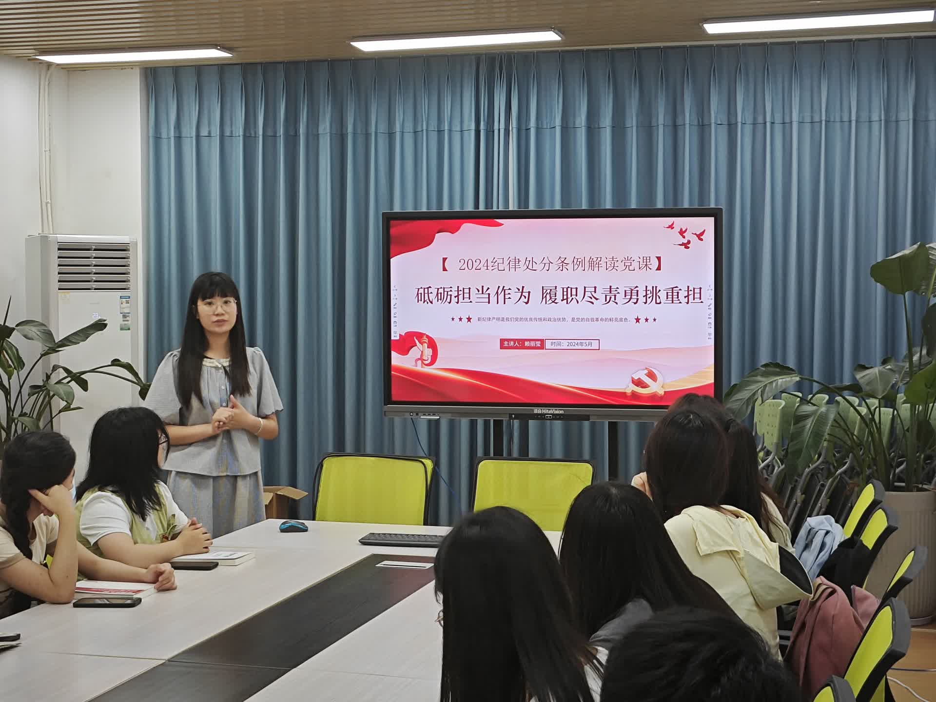 为响应习近平总书记“以学习贯彻新修订的纪律处分条例为契机,在全党开展一次集中性纪律教育”的号召,英语专业学生党支部于2024年5月24日鸿文楼(二)开展“砥砺担当作为,履职尽责勇挑重担——2024纪律处分条例解读党课,引导党员同志筑牢纪律之基,争当遵规守纪的排头兵。参与本次党课的有英语专业学生党支部书记赖丽莹、支部全体党员。