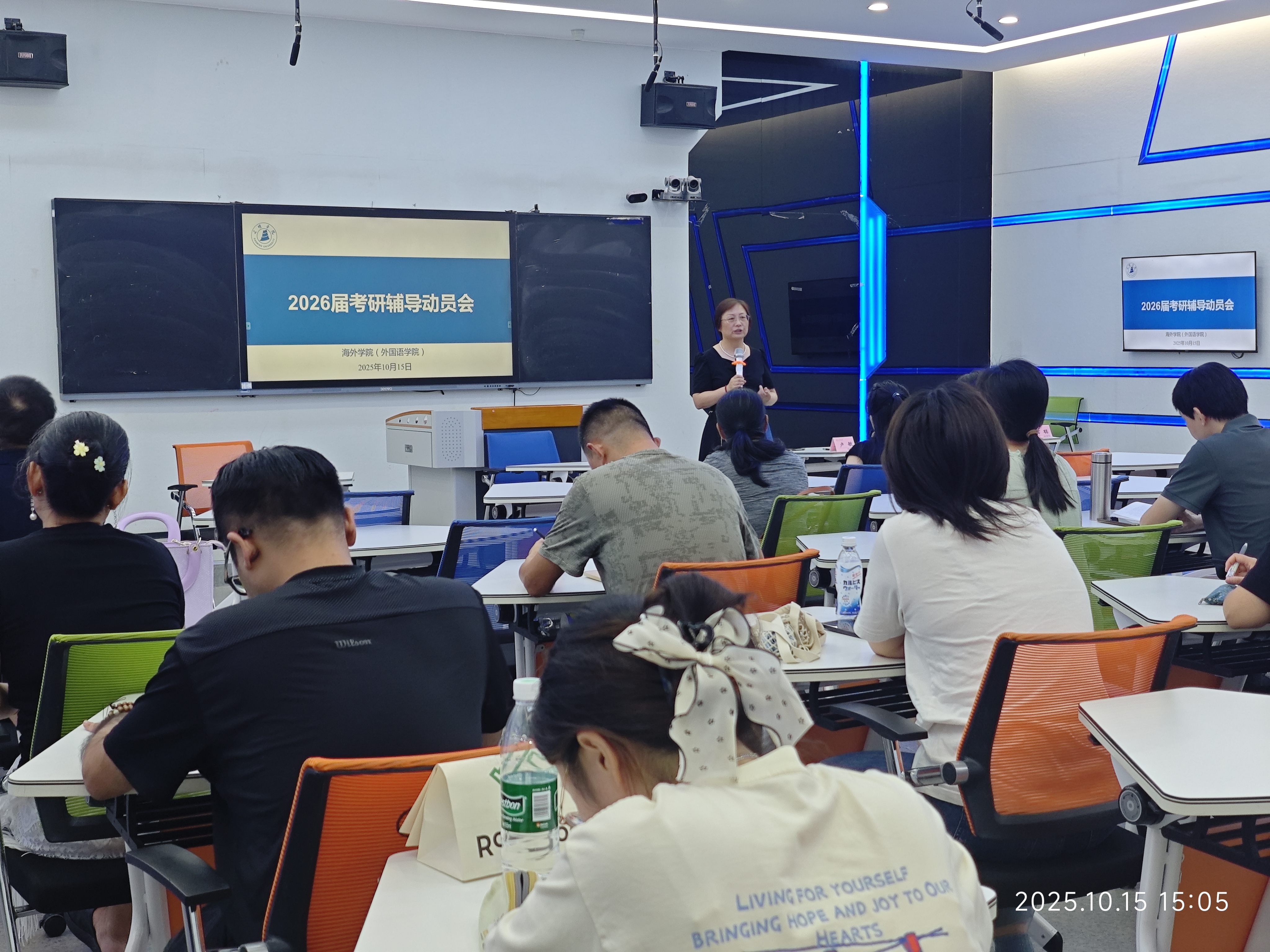为进一步提升全校学子考研英语成绩,助力学校考研录取率稳步增长,10月15日下午,海外学院(外国语学院)在鸿文楼(二)智慧教室召开考研英语辅导动员大会,全体教师参会。