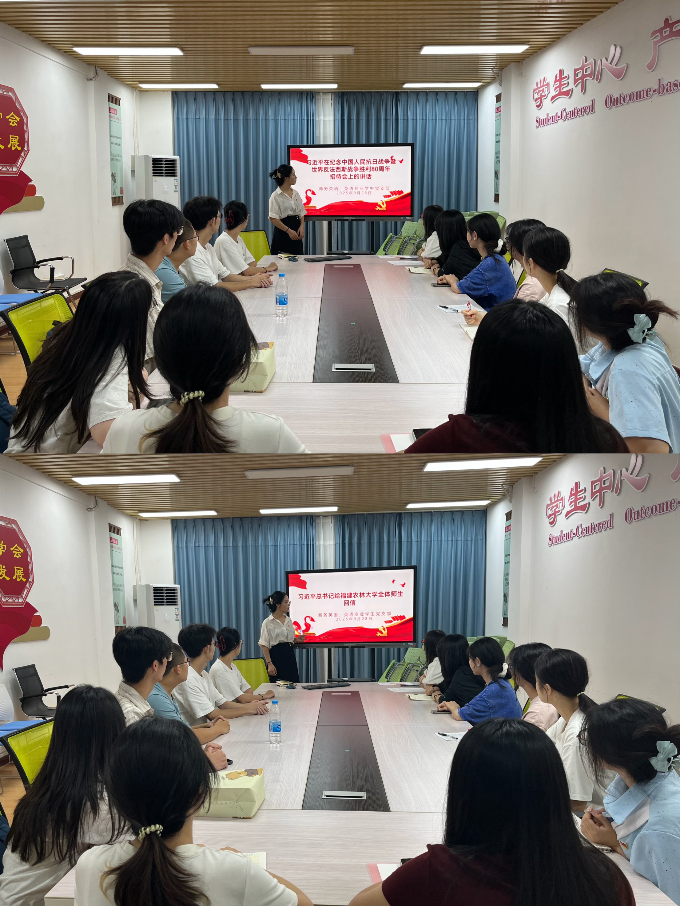 会议首个环节由支部书记带领全体党员集中学习,重点聚焦两项核心内容。学习习近平在纪念中国人民抗日战争暨世界反法西斯战争胜利80周年招待会上的讲话时,支部书记结合历史背景与时代意义,强调党员要铭记历史、缅怀先烈,从抗战精神中汲取不畏艰难、奋勇向前的力量,将爱国情怀融入专业学习与日常行动;接下来,支部书记领学习近平总书记给福建农林大学全体师生的回信,深刻领会回信中对青年学子的殷切期望,鼓励大家立足外语专业特色,以“强农有我、振兴有我”的担当,在服务国家战略、促进中外交流中找准定位、贡献力量。
