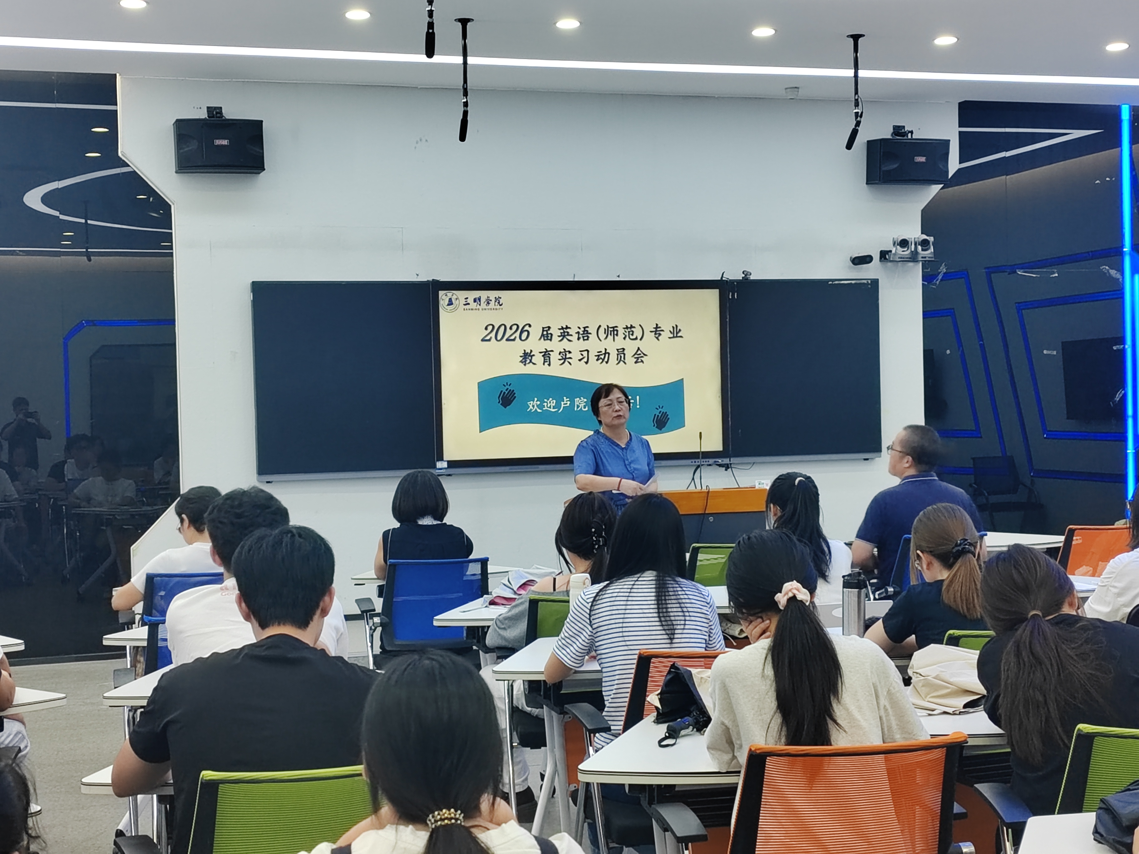 为进一步做好英语师范专业教育实习工作,明确实习任务,提振学生精神,确保实习活动顺利开展。9月2日,海外学院(外国语学院)在鸿文楼(二)B102隆重举行2026届英语(师范)专业教育实习动员大会。院长卢敏教授、院党委林云副书记、英语系主任、实习带队老师、辅导员以及全体英语师范专业实习生参加会议。