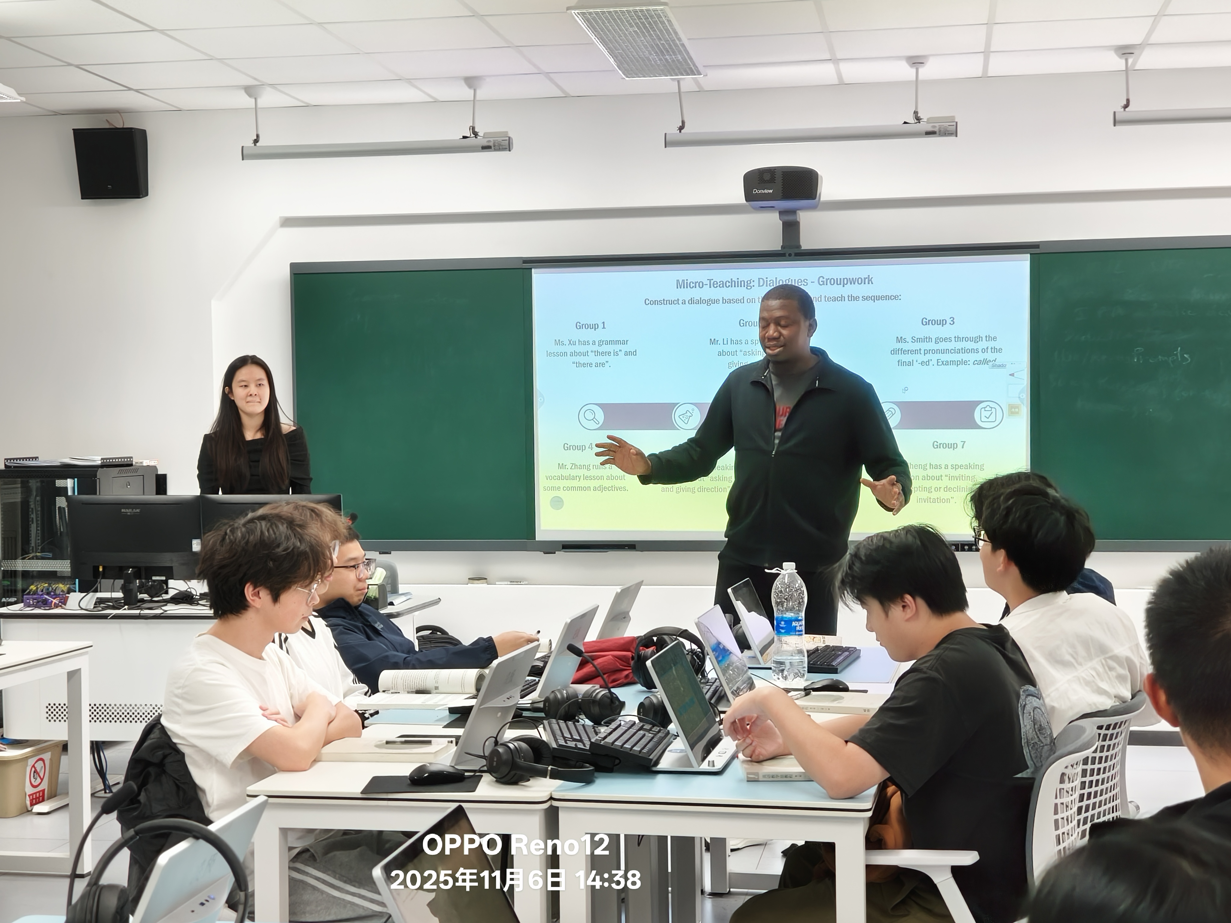 课堂以 “学生中心、产出导向” 的核心理念,充分展现了以学定教、以评促学的教学逻辑。帅建博士将学生分为若干小组,每组均明确分工:有统筹全局的主持人、展示教学成果的微课主讲人、精准点评的评论员,形成了 “人人有事做、事事有人担” 的高效协作模式。在小组微课展示环节,学生们围绕不同教学主题设计课堂方案并现场演绎,展现了扎实的专业基础。帅建博士针对每组的展示进行即时点评,既肯定亮点又直指问题,提出具体可操作的改进建议,同时引导其他小组参与互评,让 “教、学、评” 三者无缝衔接,真正实现了 “以评促学、以评促教”。整个课堂氛围活跃,学生参与度高,充分调动了学习的主动性和创造性。