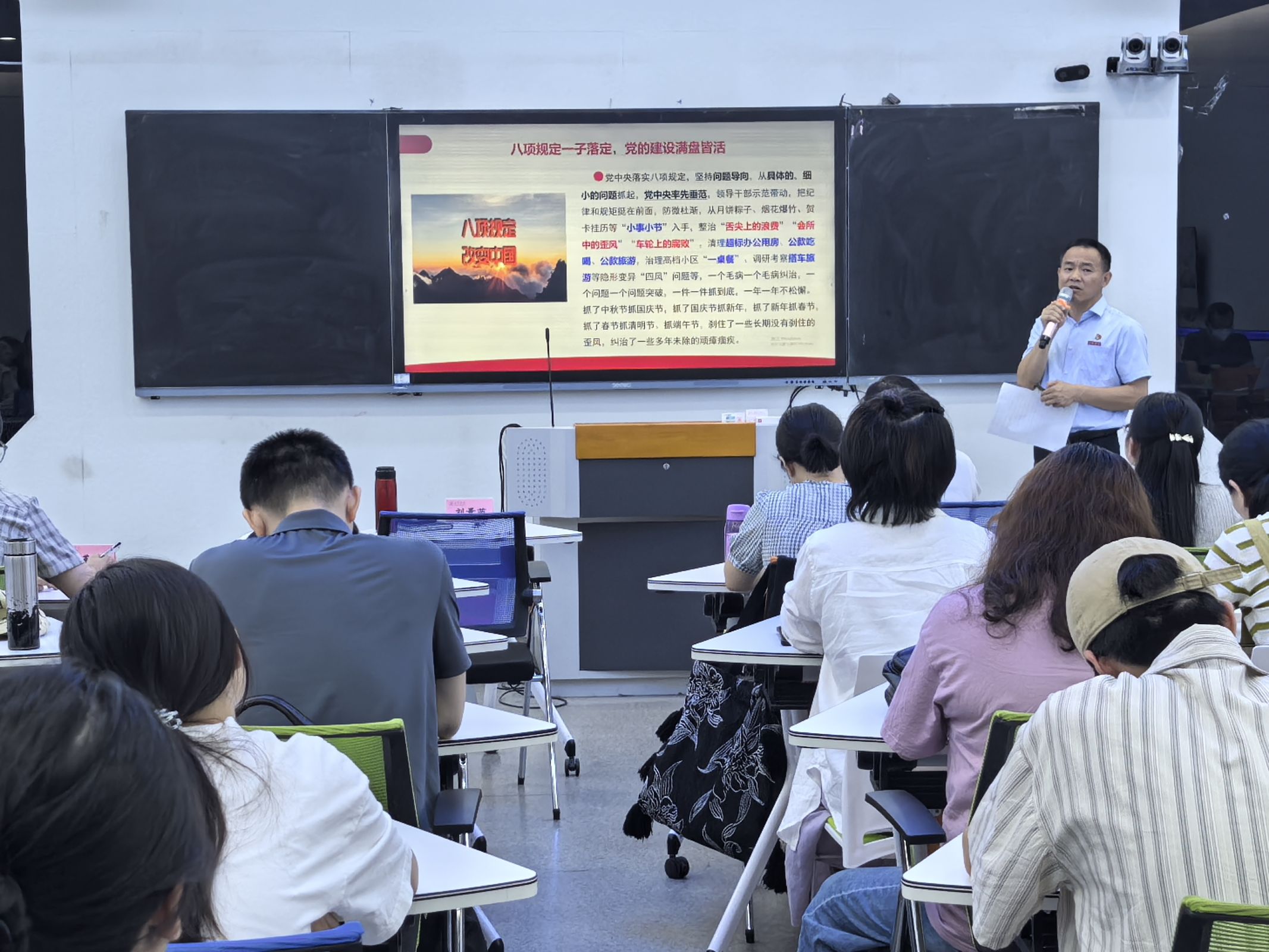 学习中,刘景苗书记围绕中央八项规定精神实质,结合教育系统案例,从规定内涵、时代意义及实践要求展开讲解,强调其对高校党风廉政建设、营造风清气正育人环境的重要性。他指出,党员要把八项规定精神融入日常,内化为政治自觉,在严守纪律底线中彰显其担当。