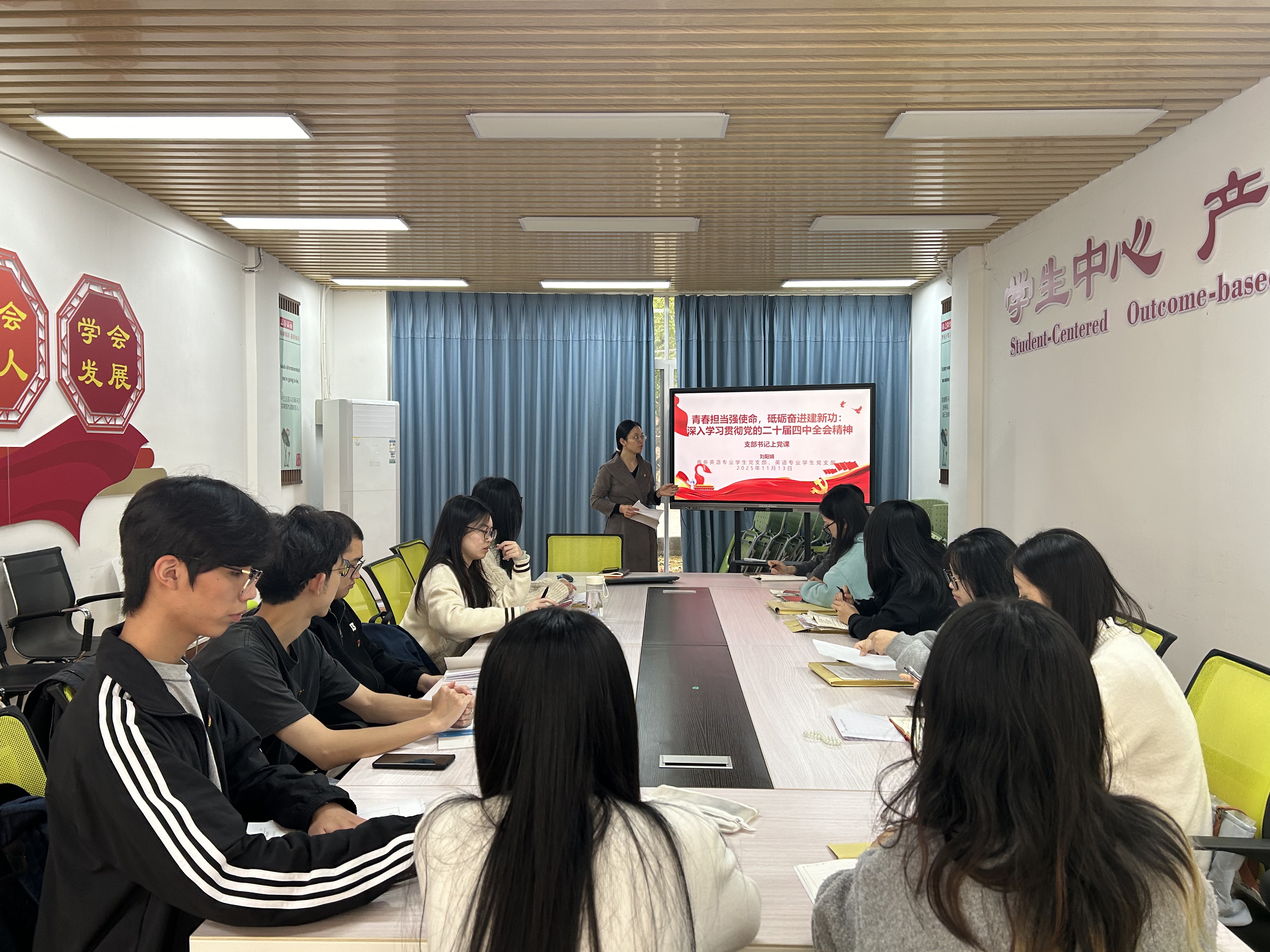 会议伊始,支部书记围绕党的二十届四中全会核心要义展开系统解读,重点阐释“扩大高水平对外开放,开创合作共赢新局面”的战略部署,指出全会精神为外语学子指明了成长方向,强调“高质量发展”理念与外语专业发展高度契合。紧接着,她结合商务英语与英语专业的学科特点,从“专业赋能国家战略”角度剖析青年党员的使命担当,鼓励商务英语专业学生深耕“商务英语+数字经济”复合能力,服务制度型开放;引导英语专业学生发挥语言优势,成为文明互鉴的“桥梁使者”,并分享国际化人才培养路径,助力学子把握“一带一路”发展机遇。最后,支部书记对全体参会人员提出明确要求:一要筑牢思想根基,将“两个维护”融入学习实践;二要锤炼专业本领,以高标准应对行业需求;三要勇担时代责任,在服务国家对外开放中彰显党员先锋本色。