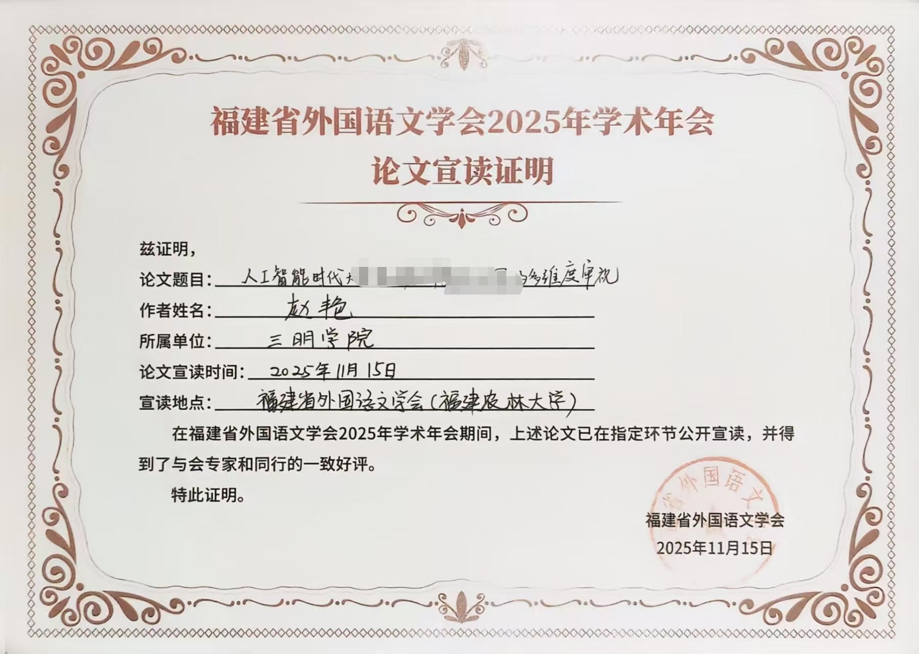 11月14至16日,福建省外国语文学会2025年学术年会暨数智时代外语教育创新与区域文化传播研讨会在福州举行,三明学院海外学院英语教师赵艳参会并完成论文宣读。