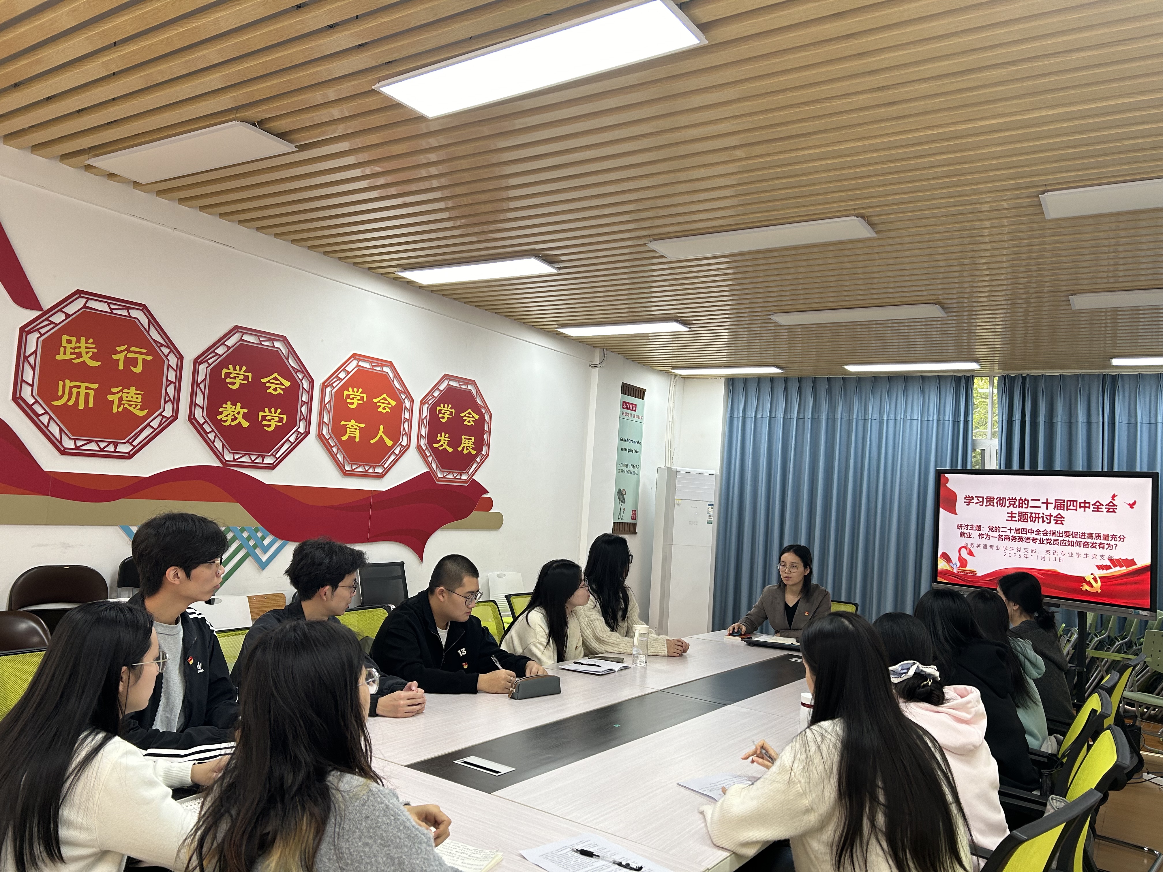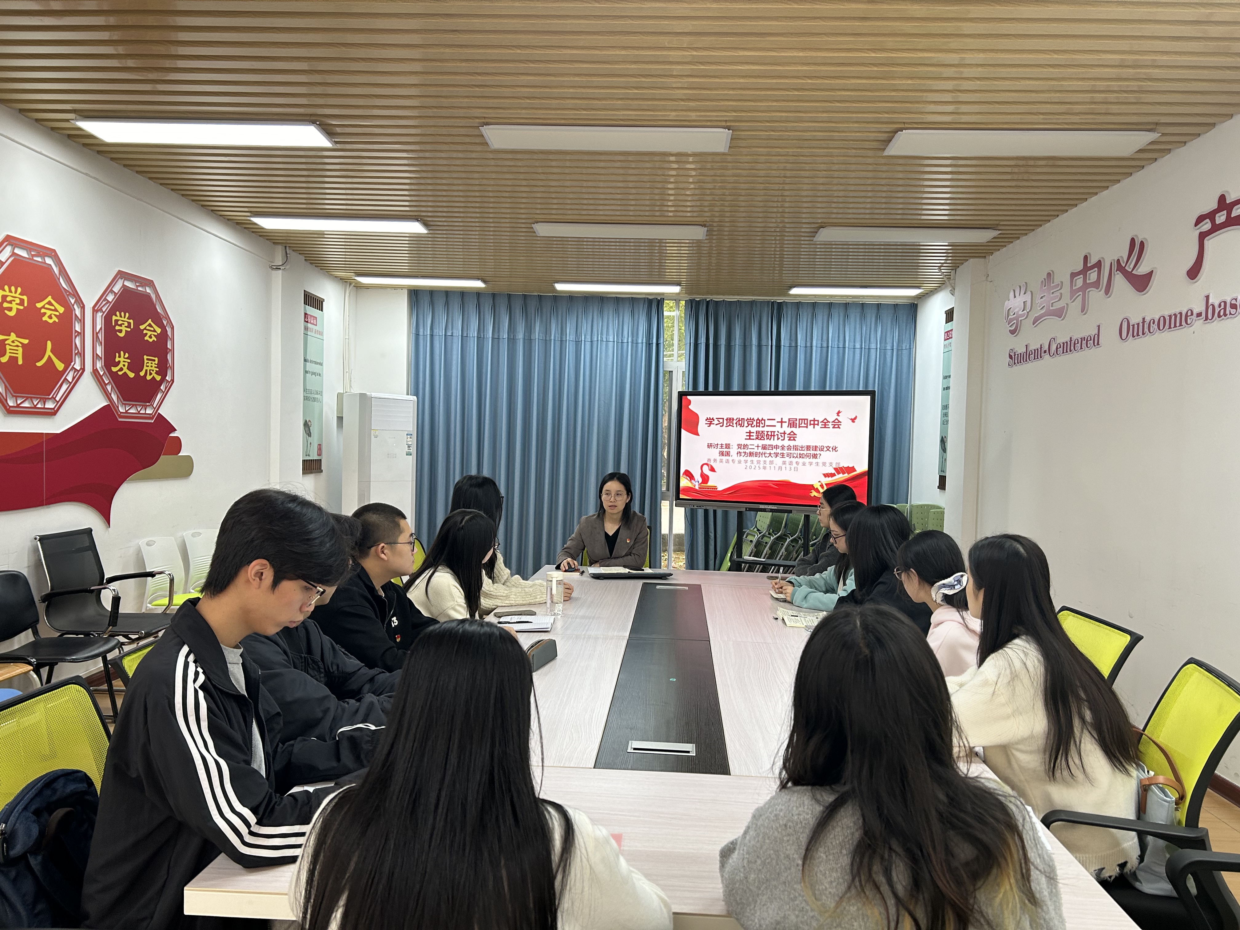 为深入学习贯彻党的二十届四中全会精神,11月13日,商务英语专业、英语专业学生党支部开展“学习贯彻党的二十届四中全会精神主题研讨会”主题党日活动。研讨会聚焦“促进高质量充分就业”和“建设文化强国”两大主题,由商务英语专业学生党支部书记刘阳娟主持,支部全体党员参加。
