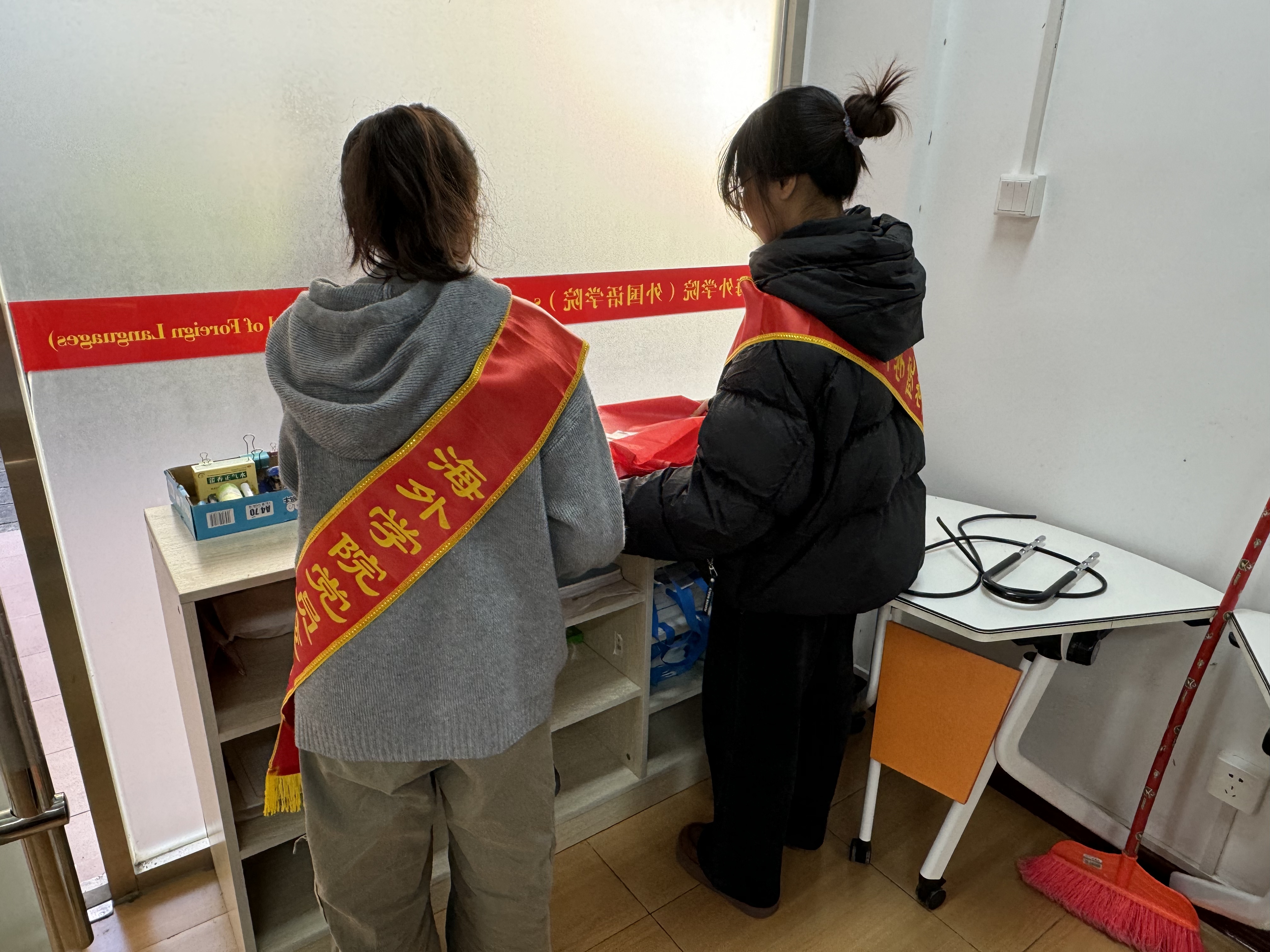 为充分发挥学生党员的先锋模范作用,践行志愿服务精神,营造整洁优美的校园学习环境,11 月 29 日下午,海外学院(外国语学院)第36期预备党员培训班学员积极响应党委号召,在鸿文楼(二)开展党员志愿服务活动,重点对C107会议室及周边多间公共教学场所进行全面清扫。