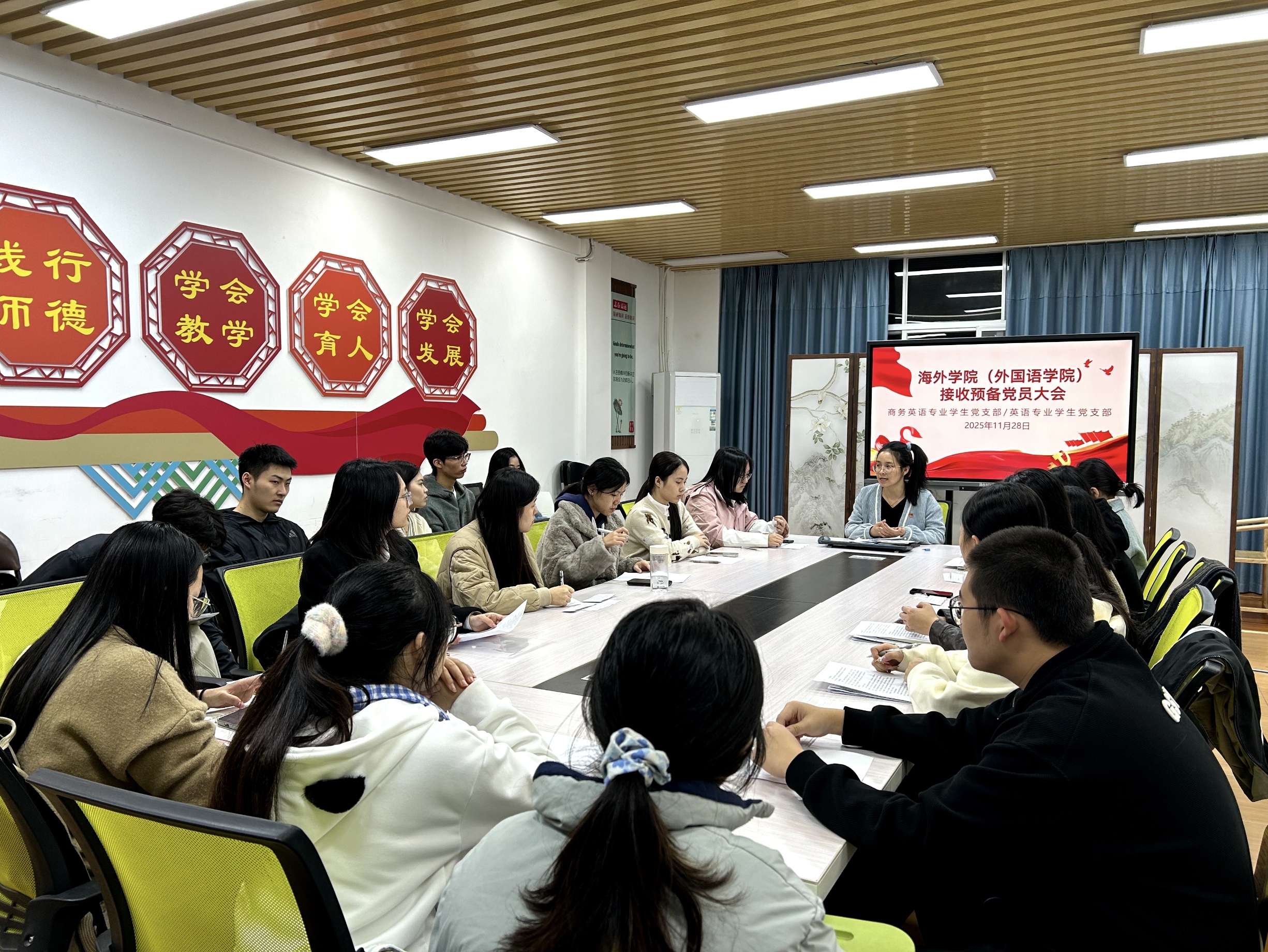 11月28日,海外学院(外国语学院)商务英语专业学生党支部在鸿文楼(二)C107会议室开展预备党员接收大会,此次会议由支部书记刘阳娟主持,支部全体党员同志参加,支部挂靠学院领导林云副书记、培养联系人列席。
