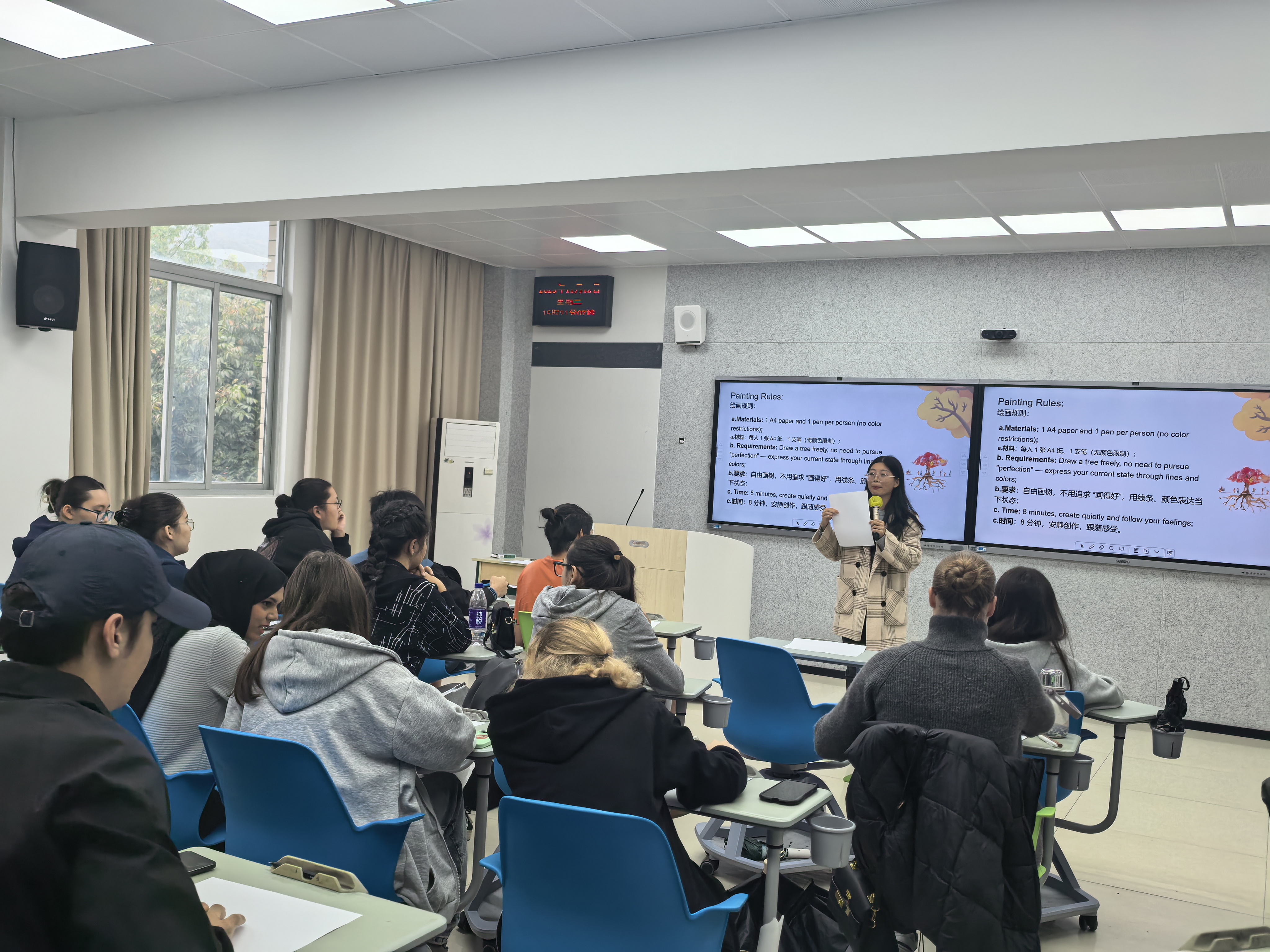 讲座伊始,郭老师以“绘画疗愈·我的‘成长之树’”互动环节拉开序幕。在8分钟的安静创作中,国际生们用线条与笔触自由表达当下的心理状态,通过作品初步梳理自我情绪,为后续的交流分享奠定基础。讲座聚焦国际生三大常见心理适应问题展开深入解析。通过PPT的讲解,结合在场国际生所提出的实际问题给与解惑,针对学习适应类、人际交往类、环境适应等问题,分析了语言不流利、文化语境差异等根源,分享了非语言沟通、加入兴趣社群、小额付出等有效沟通方法。