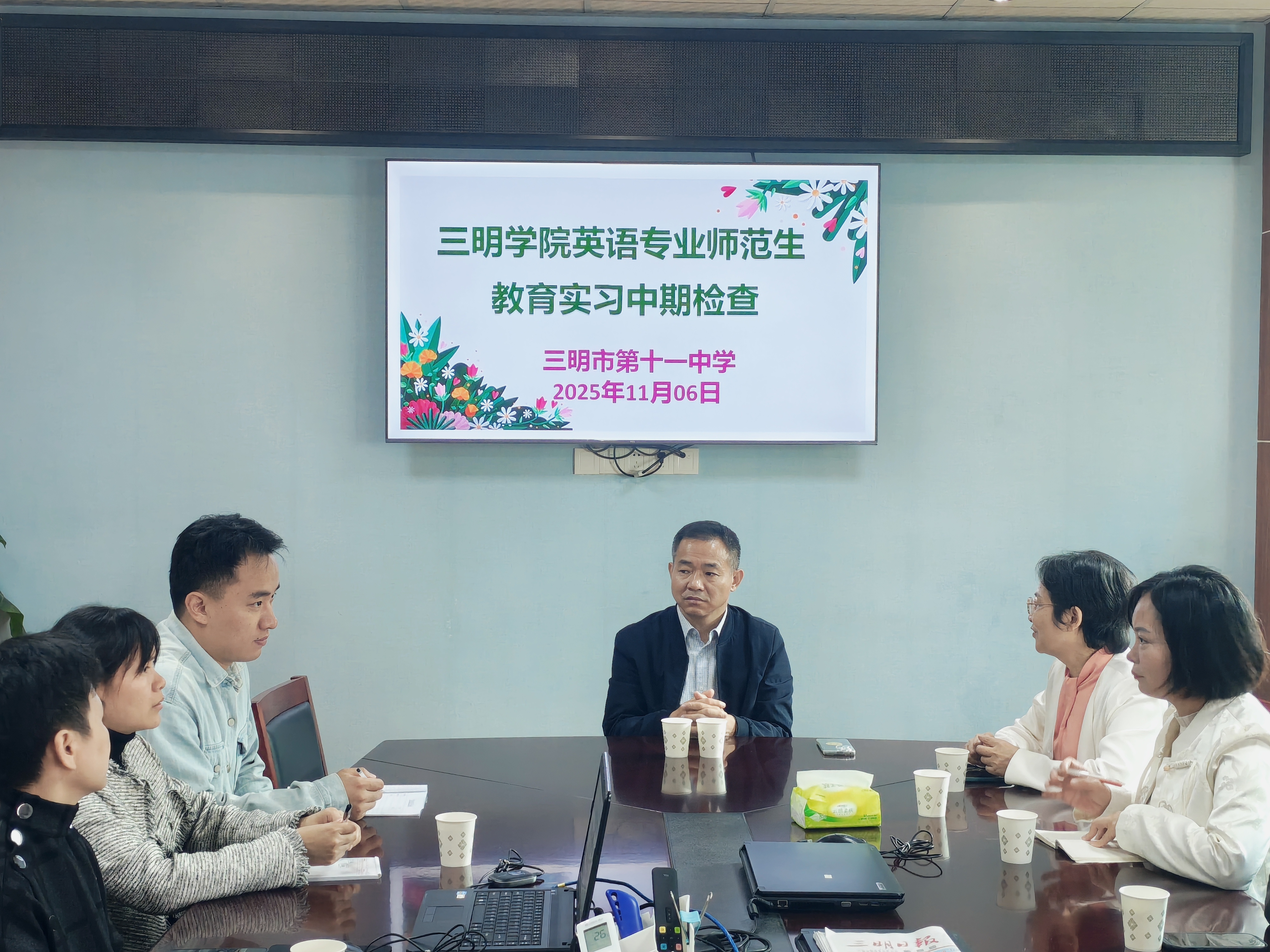 为进一步了解2022级英语专业实习生在实习学校的工作与学习状况,检验教育实习成效,深化院校协同育人机制,2025年11月6日下午,海外学院(外国语学院)党委书记刘景苗、院务委员兼英语专业负责人雷聪、实习带队教师李梅兰一行,前往三明市第十一中学开展教育实习中期检查工作。