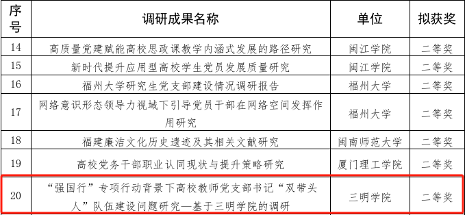 近日,中共福建省委教育工委公布了2024年度全省教育系统党建重点课题调研报告评选结果,我院申报的《“强国行”专项行动背景下高校教师党支部书记“双带头人”队伍建设问题研究——基于三明学院的调研》荣获二等奖。