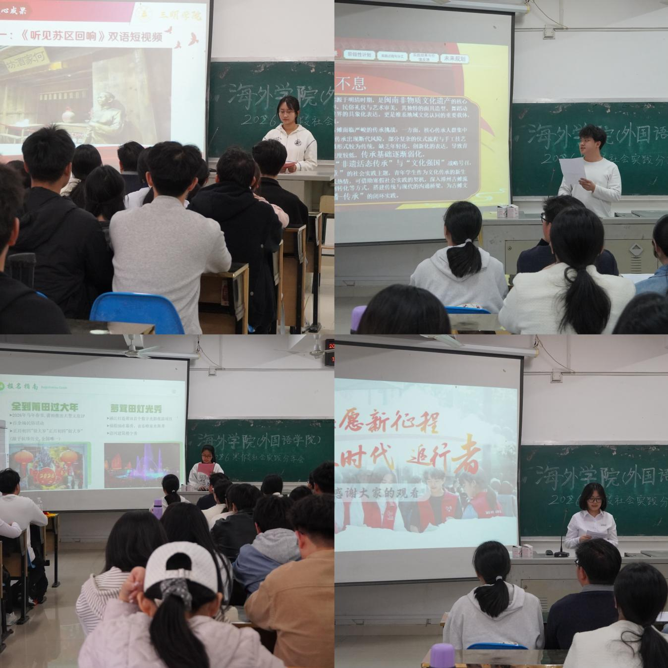 在经验分享环节,优秀团队及个人依次上台发言。他们结合自身实践经历,用鲜活的案例、从不同角度讲述了寒假社会实践中的收获与成长。有的分享深入基层社区开展志愿服务,助力基层治理的暖心故事;有的讲述参与文化调研,传承弘扬优秀传统文化的责任担当;有的交流立足专业特长,为地方发展提供语言服务、文化支持的实践心得。