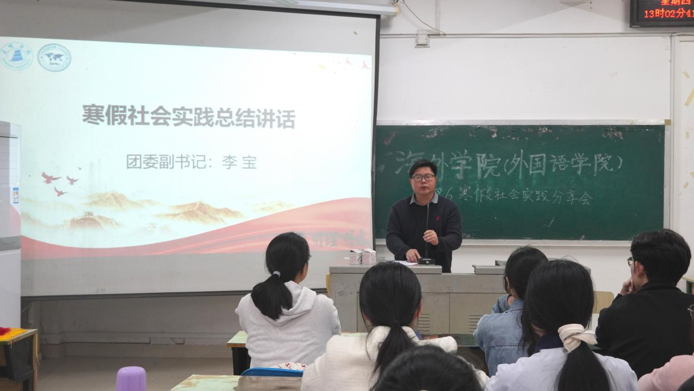 为深化实践育人成效,总结寒假社会实践经验,引导广大青年学生以实际行动为中国式现代化建设贡献青春力量,3月12日,海外学院(外国语学院)在博学楼315教室召开2026年寒假社会实践成果分享会。学院团委负责人李宝老师、团委组织部及优秀实践代表参加会议。