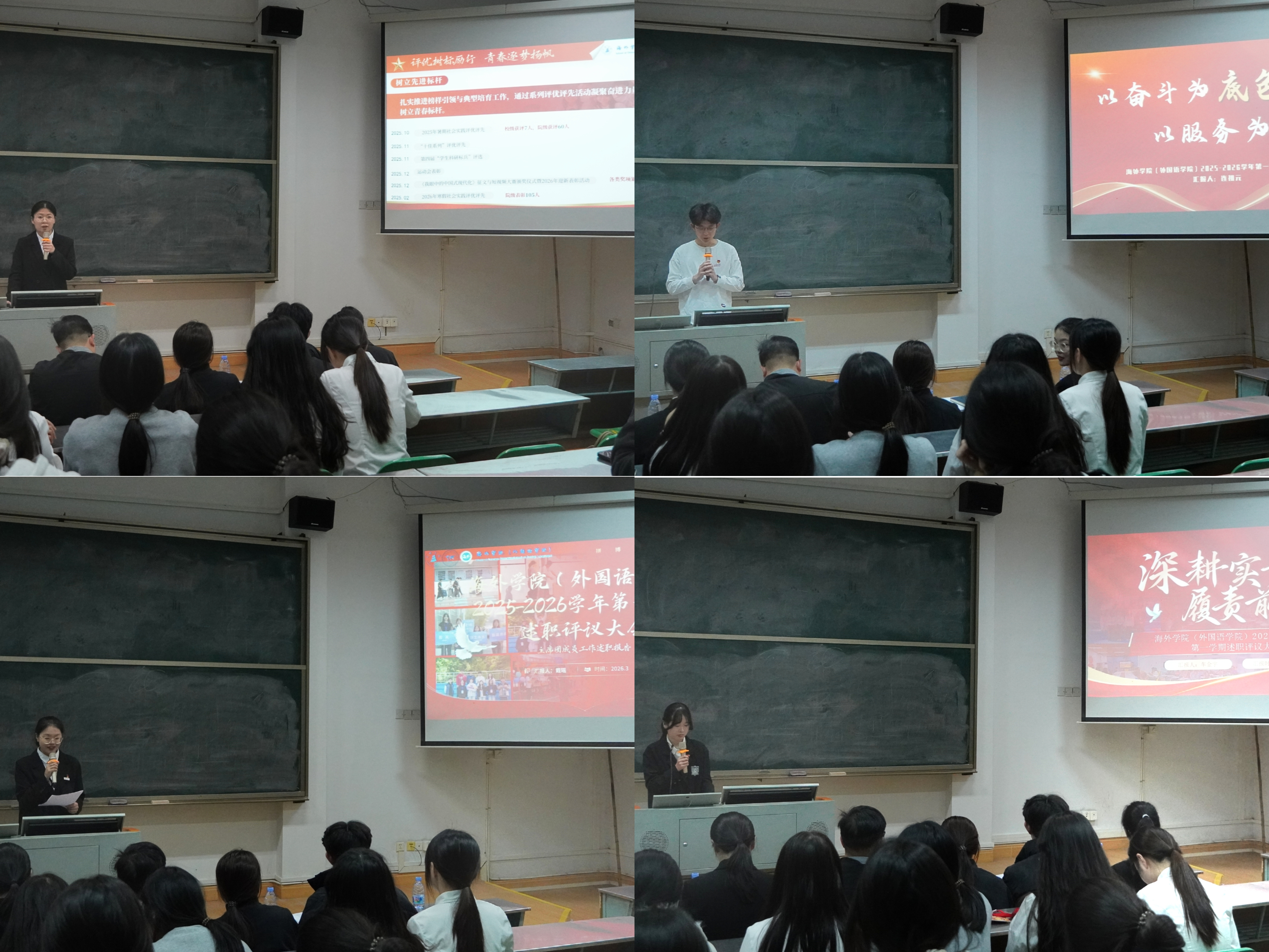 为全面总结上一阶段工作成效,明晰新学期工作思路与方向,进一步提升学生干部队伍的凝聚力、执行力与战斗力,3月16日晚,海外学院(外国语学院)团委在鸿文楼(二)B302室召开学生干部述职大会暨新学期工作布置会议。学院团委负责人李宝老师、学生会主席团成员、各协会会长及团委、学生会全体部门成员参会。