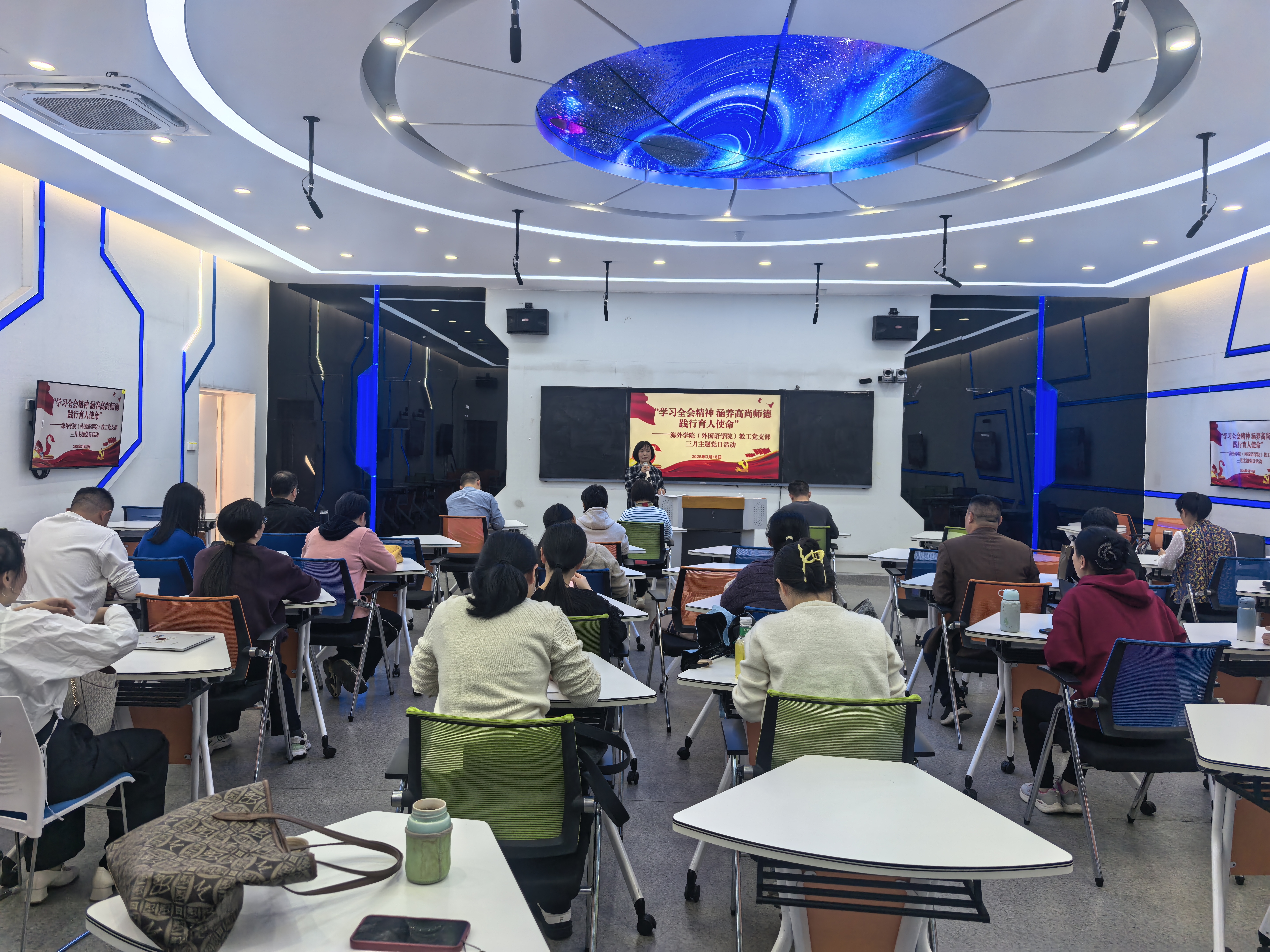 3月18日下午,海外学院(外国语学院)教工党支部以“学习全会精神 涵养高尚师德 践行育人使命”为主题,组织全体教师党员开展师德师风主题党日活动,活动先后在图书馆一楼展馆、鸿文楼(二)智慧教室开展。