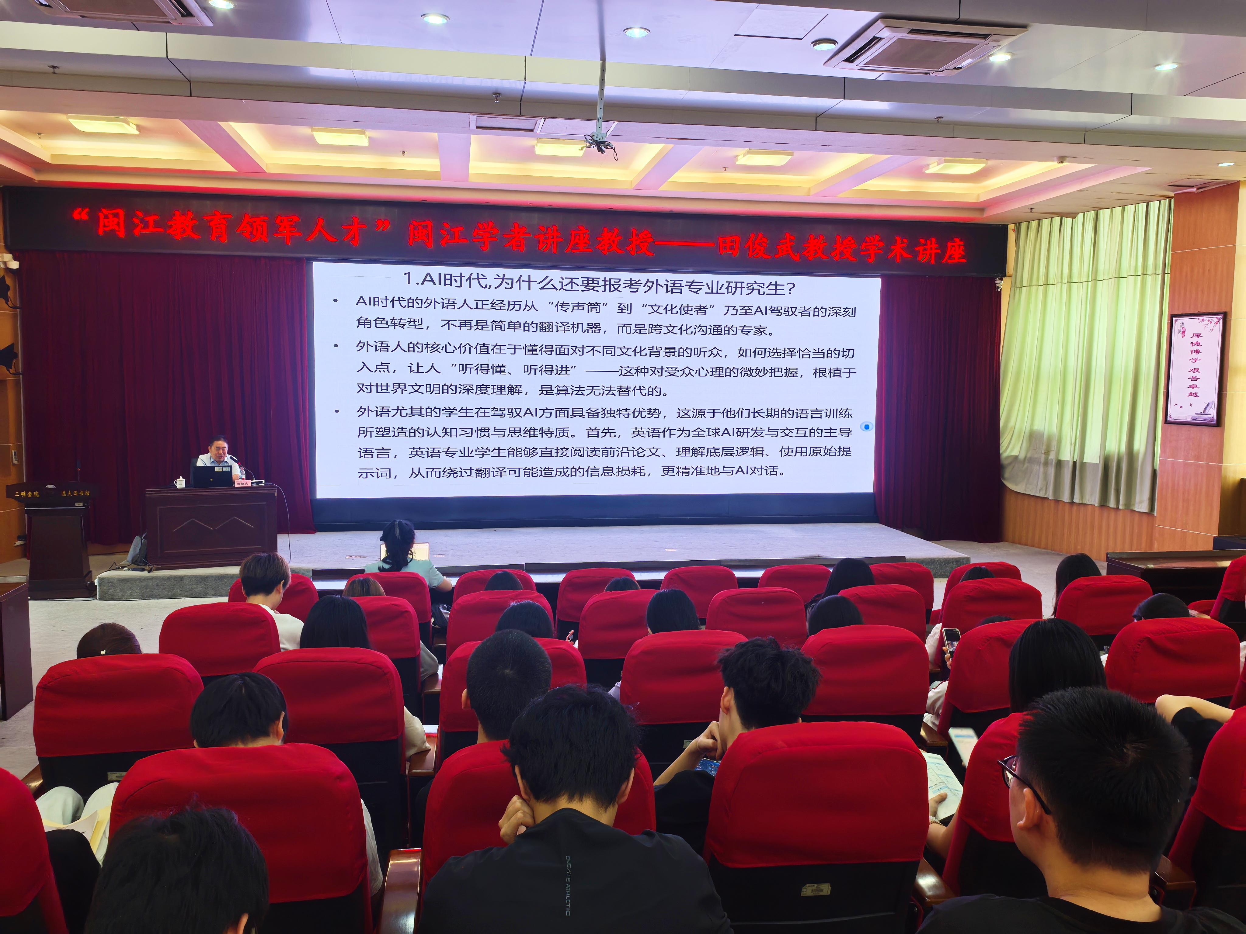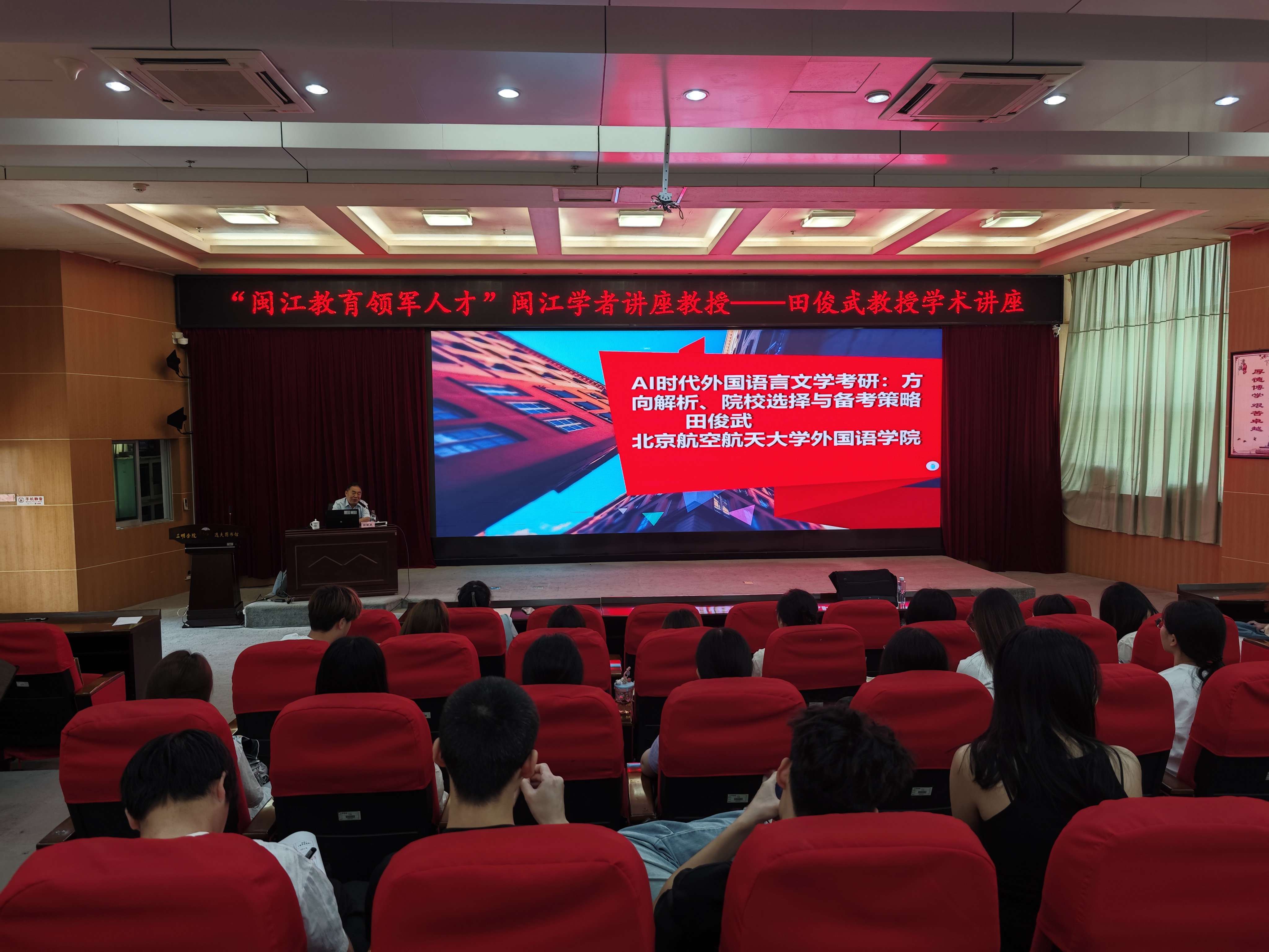 为助力我院学子明确考研方向、掌握备考策略,破解 AI 时代外语专业升学困惑,4月20日上午,“闽江教育领军人才”特聘教授、北京航空航天大学博士生导师田俊武教授,在逸夫图书馆四楼学术报告厅开展“AI时代外国语言文学考研:方向解析、院校选择与备考策略”专题考研辅导讲座。我院2023级英语(师范)、商务英语专业全体学生到场聆听,现场氛围热烈,同学们深受鼓舞。